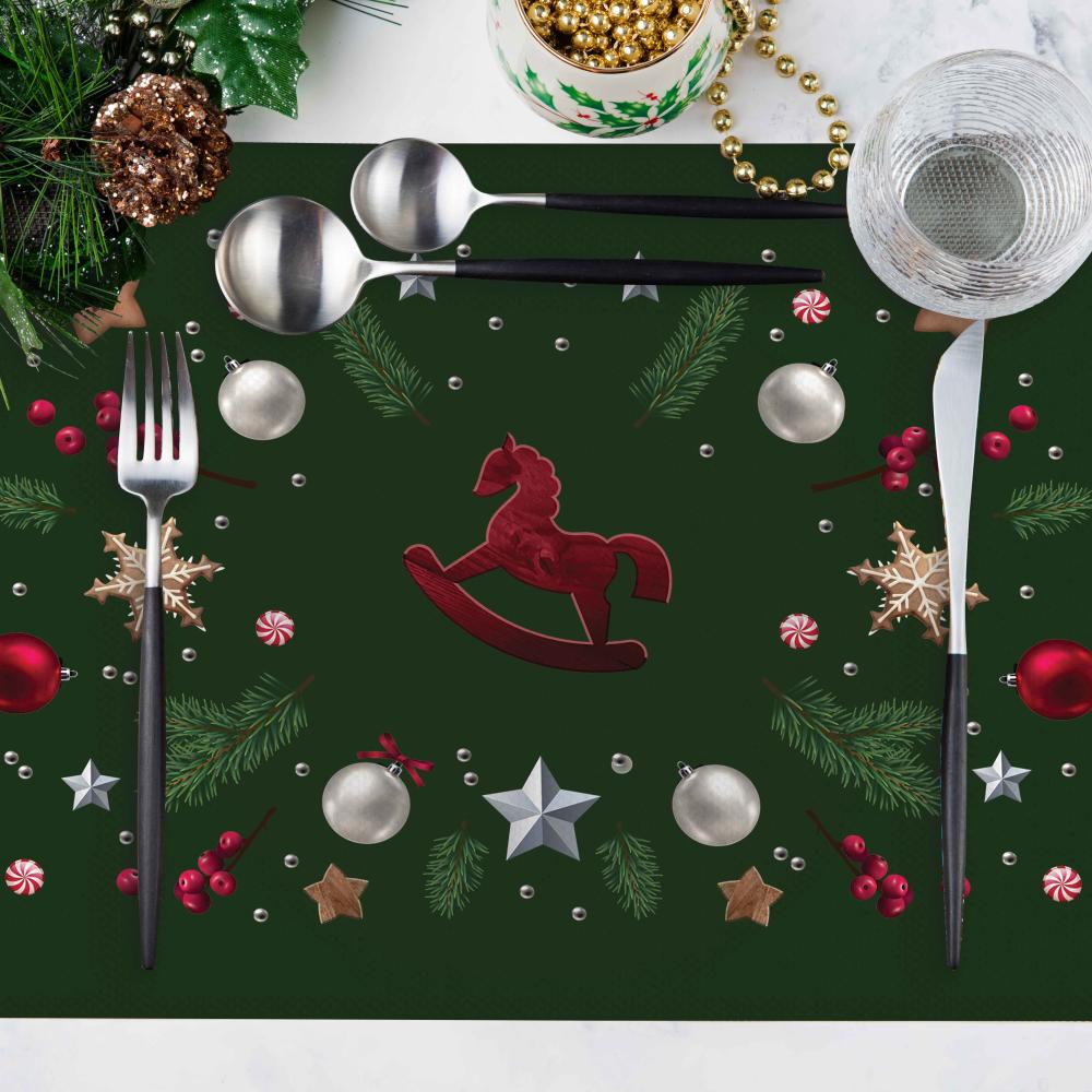 Sofrada Yılbaşı Şıklığı At Figürlü Çam Süslemeli Amerikan Servis – 4'lü Set (30x50 cm)